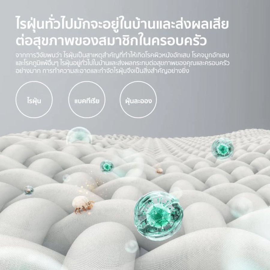 ● การอบแห้งด้วยลมร้อน50 °C: ผ้าปูที่นอนแห้งและสามารถยับยั้งแบคทีเรียและไรได้