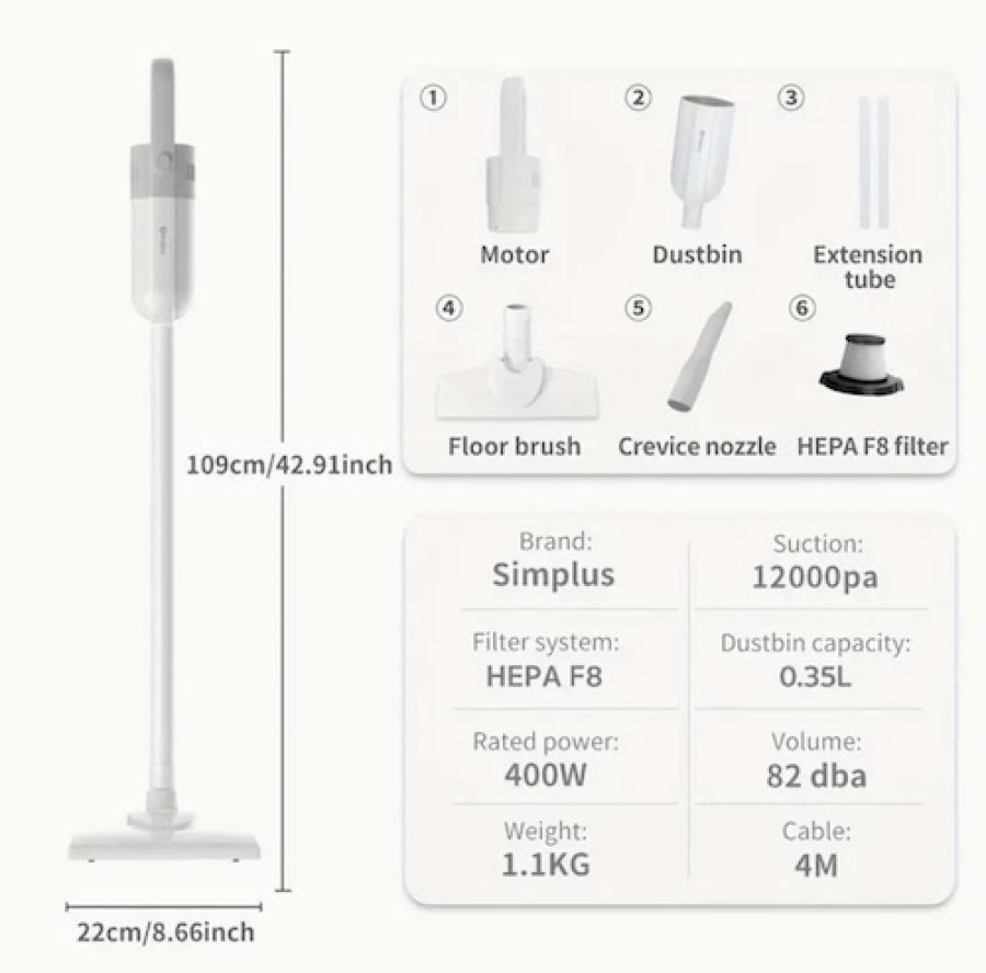 เครื่องดูดฝุ่นแบบมีสาย Simplus Simple 400W กำลังสูง เครื่องดูดฝุ่นอเนกประสงค์ ความยาวสาย 4 เมตร/157 นิ้ว