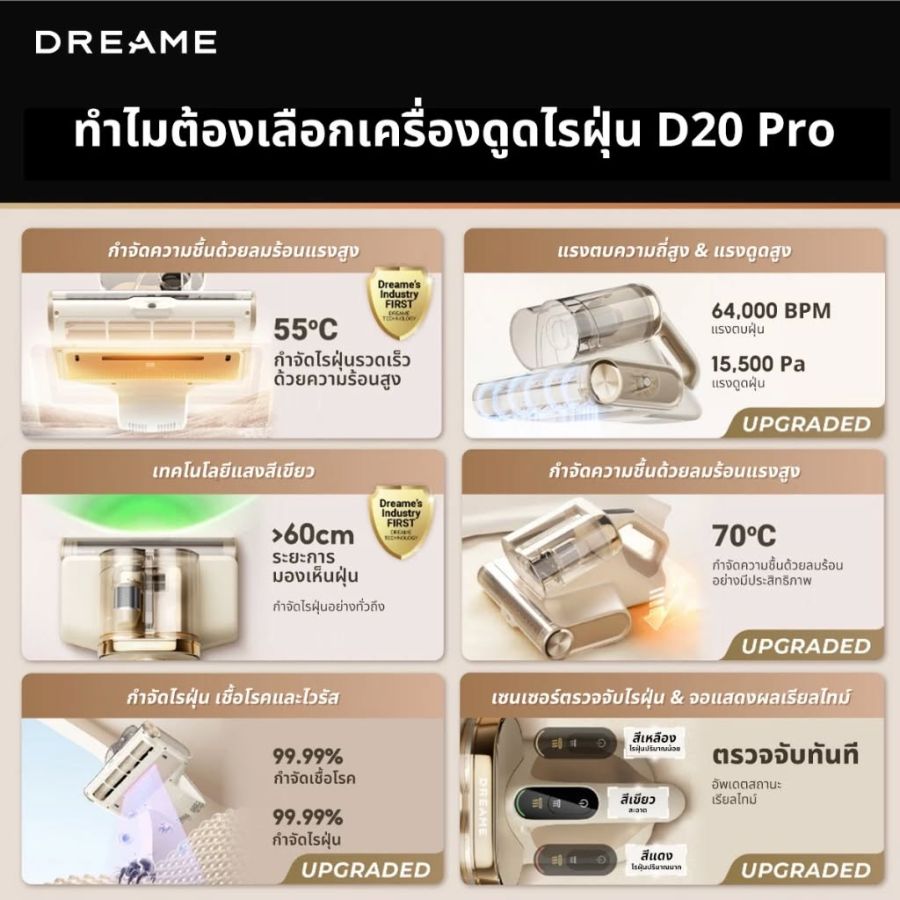 Dreame D20 Pro Mite Remover เครื่องดูดไรฝุ่น | 15.5KPa แรงดูดสูง | ลดความชื้นด้วยลมร้อน 70°C