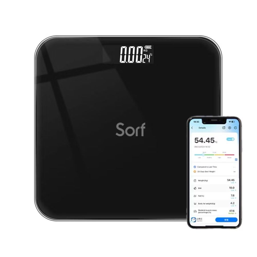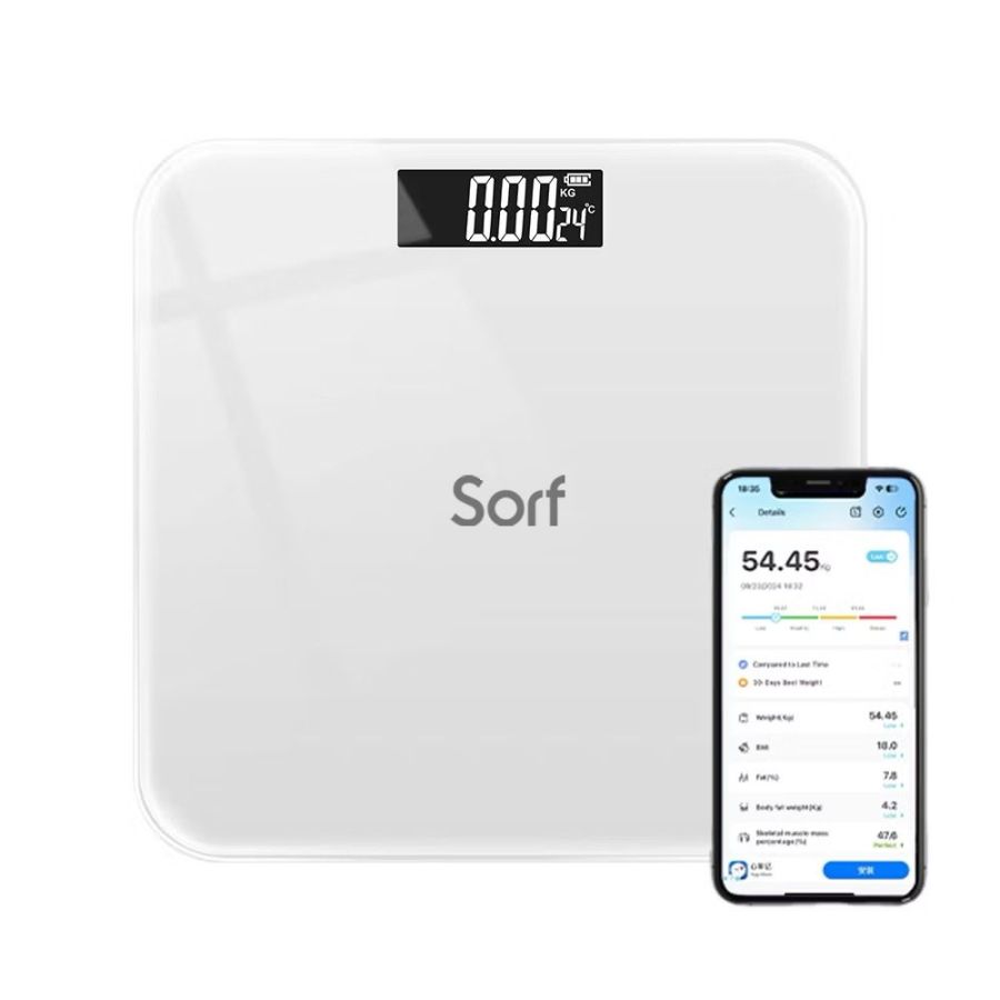 Sorf เครื่องชั่งน้ำหนัก วัดไขมัน 180kg วัดไขมัน BMI21 ค่า เชื่อมต่อแอพ iOS/Android ชาร์จ USB หน้าปัดกระจก